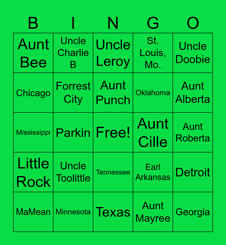 This bingo card has a free space and 24 words: MaMean, Uncle Toolittle, Aunt Punch, Aunt Mayree, Uncle Doobie, Aunt Bee, Uncle Charlie B, Uncle Leroy, Aunt Cille, Aunt Roberta, Mississippi, Forrest City, Earl Arkansas, Detroit, Chicago, Minnesota, Texas, St. Louis, Mo., Aunt Alberta, Little Rock, Parkin, Tennessee, Oklahoma and Georgia.