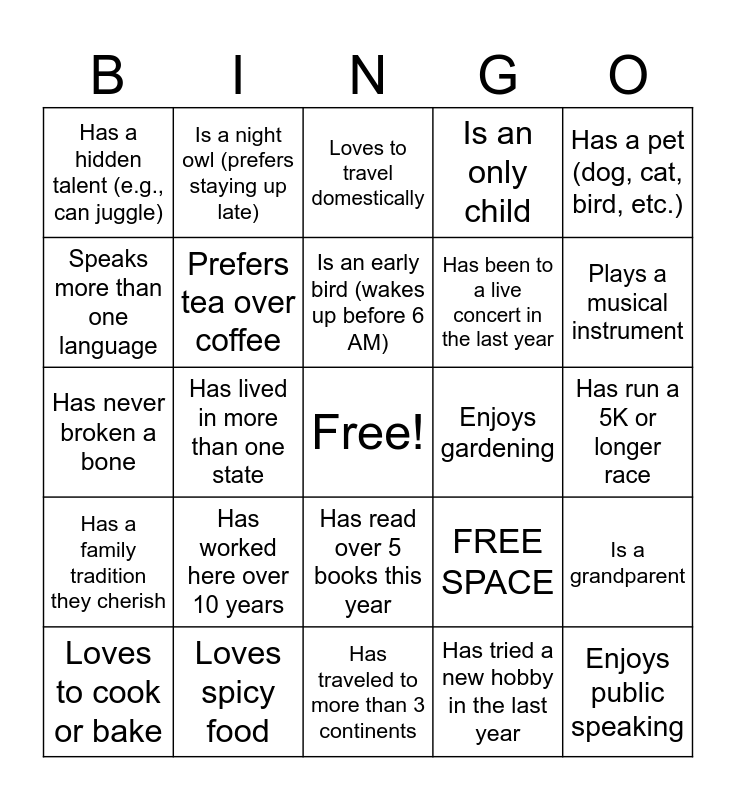 This bingo card has a free space and 25 words: Has worked here over 10 years, Has traveled to more than 3 continents, Is an early bird (wakes up before 6 AM), Loves to cook or bake, Has a pet (dog, cat, bird, etc.), Has a hidden talent (e.g., can juggle), Speaks more than one language, Is a night owl (prefers staying up late), Enjoys gardening, Has read over 5 books this year, Has been to a live concert in the last year, Has never broken a bone, FREE SPACE, Is a grandparent, Prefers tea over coffee, Has a favorite podcast they regularly listen to, Has run a 5K or longer race, Loves to travel domestically, Plays a musical instrument, Has lived in more than one state, Enjoys public speaking, Loves spicy food, Has a family tradition they cherish, Is an only child and Has tried a new hobby in the last year.