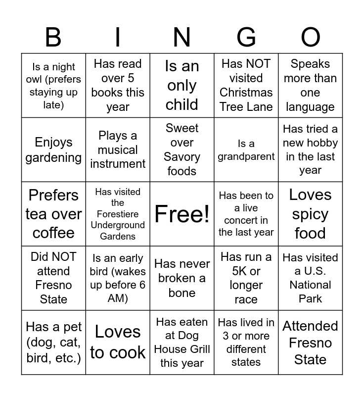 This bingo card has a free space and 24 words: Is an early bird (wakes up before 6 AM), Loves to cook, Sweet over Savory foods, Has a pet (dog, cat, bird, etc.), Speaks more than one language, Is a night owl (prefers staying up late), Enjoys gardening, Has read over 5 books this year, Has been to a live concert in the last year, Has never broken a bone, Is a grandparent, Prefers tea over coffee, Has run a 5K or longer race, Has visited a U.S. National Park, Plays a musical instrument, Has lived in 3 or more different states, Loves spicy food, Is an only child, Has tried a new hobby in the last year, Has visited the Forestiere Underground Gardens, Attended Fresno State, Did NOT attend Fresno State, Has NOT visited Christmas Tree Lane and Has eaten at Dog House Grill this year.
