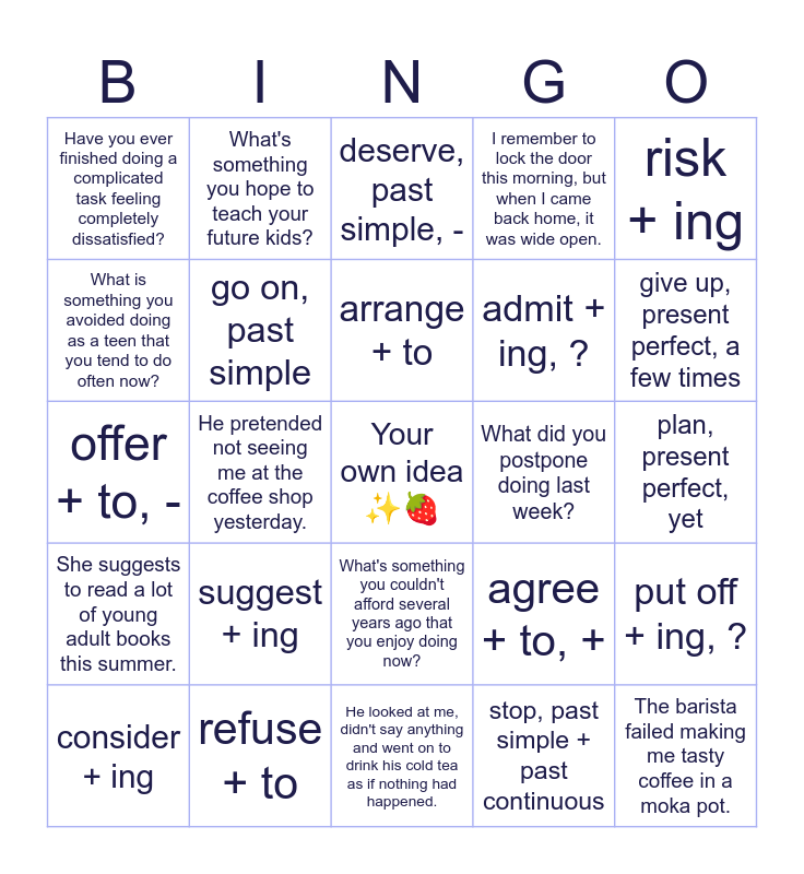 This bingo card has a free space and 24 words: suggest + ing, refuse + to, arrange + to, consider + ing, risk + ing, Have you ever finished doing a complicated task feeling completely dissatisfied?, What is something you avoided doing as a teen that you tend to do often now?, What's something you hope to teach your future kids?, What did you postpone doing last week?, What's something you couldn't afford several years ago that you enjoy doing now?, admit + ing, ?, offer + to, -, agree + to, +, put off + ing, ?, go on, past simple, stop, past simple + past continuous, plan, present perfect, yet, deserve, past simple, -, give up, present perfect, a few times, He pretended not seeing me at the coffee shop yesterday., The barista failed making me tasty coffee in a moka pot., She suggests to read a lot of young adult books this summer., I remember to lock the door this morning, but when I came back home, it was wide open. and He looked at me, didn't say anything and went on to drink his cold tea as if nothing had happened..