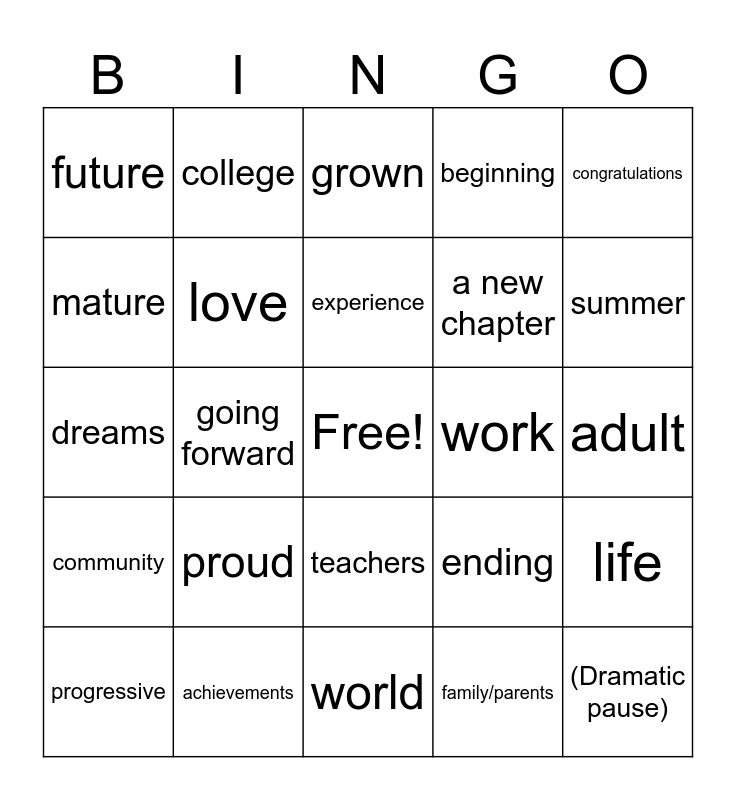 This bingo card has a free space and 24 words: proud, achievements, experience, progressive, congratulations, future, mature, college, work, teachers, a new chapter, dreams, ending, life, love, family/parents, adult, grown, summer, going forward, (Dramatic pause), community, beginning and world.