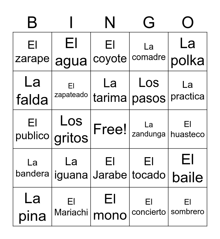 This bingo card has a free space and 29 words: La pina, El charro, Los gritos, Las botas, El zarape, El coyote, El zapateado, La iguana, La zandunga, El Mariachi, El huasteco, El sombrero, El mono, El concierto, La practica, La adelita, El Jarabe, La bandera, La polka, El publico, El tocado, La Miss, Los pasos, La falda, La comadre, El agua, El baile, La tarima and El remate.