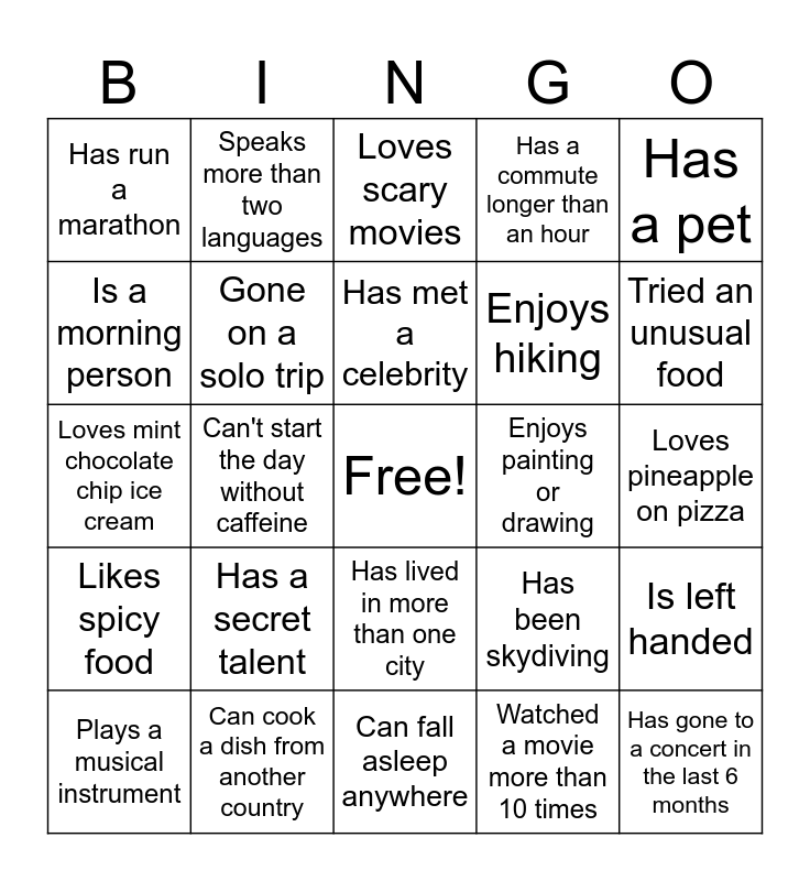This bingo card has a free space and 24 words: Has a secret talent, Can cook a dish from another country, Has met a celebrity, Plays a musical instrument, Has a pet, Has run a marathon, Is a morning person, Speaks more than two languages, Enjoys painting or drawing, Has lived in more than one city, Enjoys hiking, Loves mint chocolate chip ice cream, Has been skydiving, Is left handed, Gone on a solo trip, Watched a movie more than 10 times, Loves pineapple on pizza, Loves scary movies, Tried an unusual food, Can't start the day without caffeine, Has gone to a concert in the last 6 months, Likes spicy food, Has a commute longer than an hour and Can fall asleep anywhere.