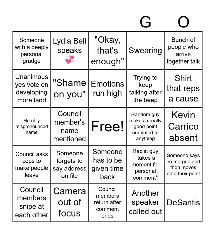 This bingo card has a free space and 47 words: Joe Biden, DeSantis, 4+ missing council members, Council members return after comment ends, Someone forgets to say address on file, Someone says their whole address, Lydia Bell speaks 💞, Someone tries to appeal to humanity, Unanimous yes vote on developing more land, Too many people clap to arrest, "Shame on you", Swearing, Someone says no morgue and then moves onto their point, Racist guy "takes a moment for personal comment", 5+ keffiyehs, ACPS girl, Emotions run high, Random guy makes a really good point unrelated to anything, Only white men present at council, Bunch of people who arrive together talk, Council member's name mentioned, Another speaker called out, Someone with a deeply personal grudge, Trying to keep talking after the beep, "Woke", Shirt that reps a cause, Council members snipe at each other, HUGE earrings, Someone has to be given time back, Council asks cops to make people leave, Randy White looks like he might be dead, Mention of CA or NY, Jaxport mention, Appeals to Christianity, A bill that wants to kill babies or something, Camera out of focus, Kevin Carrico absent, Joe Carlucci absent, Council member openly texting, TK Waters, JSO being criminal mention, "Okay, that's enough", Horribly mispronounced name, Guy not able to pronounce a very common word, Inter-council tension, "I am here as a" and Threatening the council's jobs.
