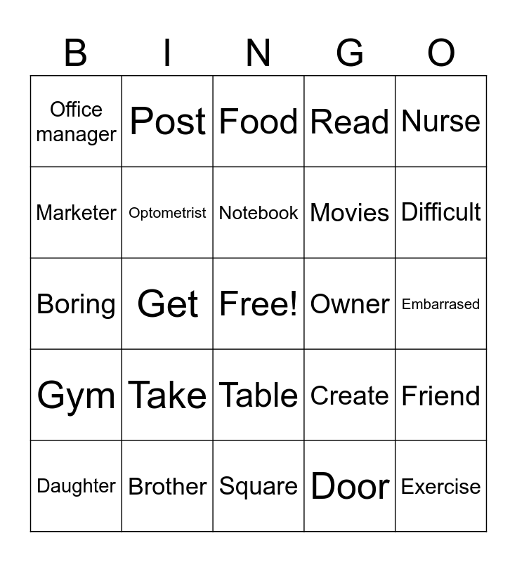 This bingo card has a free space and 83 words: Favorite, First, Food, Hello, Hobbies, Hometown, Meet, Nice, Accountant, Technician, Uncle, Grandfather, Optometrist, Owner, Interpreter, Office manager, Daughter, Marketer, Games, Audiobooks, Tennis, Movies, Exercise, Go, Get, Get up, Hang out, Have, Order, Start, Take, Walk, Across, Boring, Expensive, On, Square, Apartment, Difficult, Gym, Popular, Tiny, Selfie, Afraid, Mad, Download, Post, Play, Smartphone, Upload, Create, Read, Embarrased, Nickname, Mother, Engineer, Teacher, Father, Brother, Sister, Teacher, Student, Doctor, Nurse, Police, Friend, Family, School, Classroom, Pen, Pencil, Book, Chair, Table, Door, Window, Bag, Notebook, Lunch, Water, Juice, Sleep and Sing.