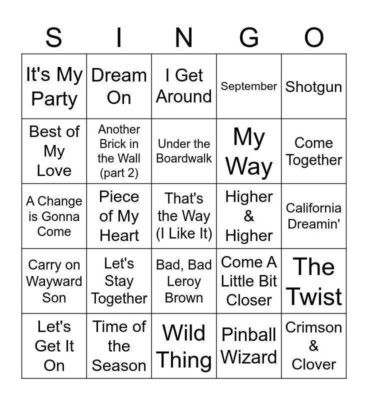 This bingo card has 100 words: Stand by Me, Twist and Shout, California Dreamin', Proud Mary, I Want You Back, My Girl, Can't Take My Eyes Off You, Respect, Paint It, Black, Oh, Pretty Woman, You Can't Hurry Love, Brown Eyed Girl, At Last, Time of the Season, Happy Together, Be My Baby, My Way, I Can't Help Myself (Sugar Pie, Honey Bunch), Ain't No Mountain High Enough, These Boots Are Made for Walkin', Son Of A Preacher Man, My Cherie Amour, Hit the Road Jack, I'm a Believer, When a Man Loves a Woman, Higher & Higher, Shotgun, Come A Little Bit Closer, What A Wonderful World, Walk on By, Piece of My Heart, It's My Party, You Really Got me, Good Vibrations, Pinball Wizard, Under the Boardwalk, The Twist, Like a Rolling Stone, I Got You Babe, Crimson & Clover, Someday We'll Be Together, I Second That Emotion, A Change is Gonna Come, Bad moon Rising, Come Together, I Get Around, Stop! In The Name Of Love, Sugar, Sugar, My Guy, Wild Thing, Rocket Man, ABC, Staying Alive, Dancing Queen, Hotel California, Dreams, Baby Come Back, Da Ya Think I'm Sexy?, A Horse with No Name, September, Superstition, You're So Vain, Hot Stuff, What a Fool Believes, I Will Survive, Baker Street, Piano Man, Angie, You're The One That I Want, American Pie, The Joker, Let's Stay Together, Seasons of the Sun, Brandy (You're a Fine Girl), Let Your Love Flow, Bohemian Rhapsody, Sultans Of Swing, Best of My Love, Heart of Glass, Alone Again (Naturally), Sister Golden Hair, That's the Way (I Like It), Don't Stop 'Til You Get Enough, Bad, Bad Leroy Brown, Afternoon Delight, Dream On, Come and Get Your Love, Have You Ever Seen The Rain, Stuck In The Middle With You, Carry on Wayward Son, Sweet Home Alabama, Take Me Home, Country Roads, Stairway to Heaven, Let's Get It On, Another Brick in the Wall (part 2), (Don't Fear) The Reaper, Black Betty, Don't Go Breaking My Heart, Barracuda and Cat's in the Cradle.