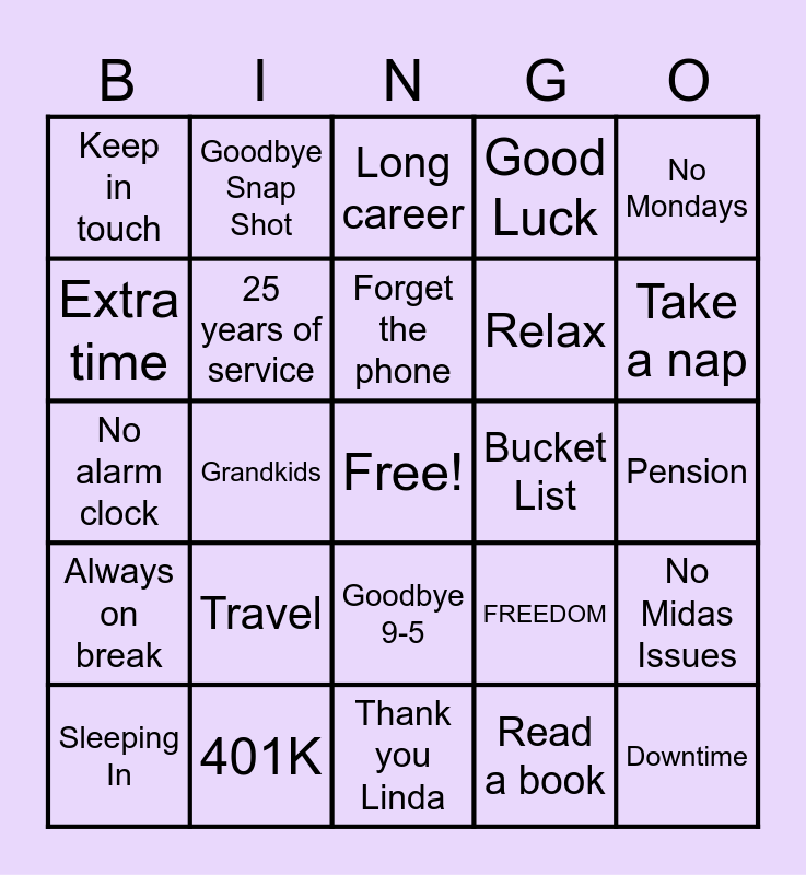 This bingo card has a free space and 29 words: Sleeping In, Cruise Vacation, Grandkids, Big shoes to fill, Keep in touch, Long career, 25 years of service, Travel, Bucket List, 401K, Pension, Downtime, Thank you Linda, Read a book, Take a nap, Take me with you, Goodbye 9-5, Always on break, No Mondays, No alarm clock, FREEDOM, New Chapter, Relax, Extra time, Good Luck, Goodbye Snap Shot, No Midas Issues, Forget the phone and Family.