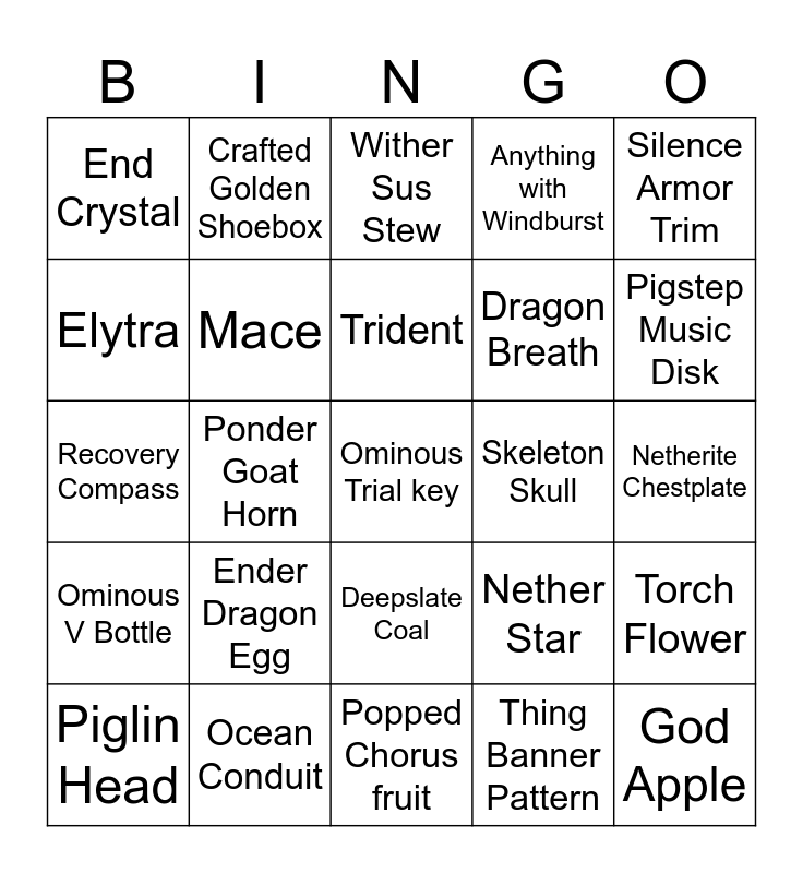 This bingo card has 25 words: Ender Dragon Egg, Popped Chorus fruit, Trident, Piglin Head, Silence Armor Trim, End Crystal, Elytra, Crafted Golden Shoebox, Skeleton Skull, Deepslate Coal, Dragon Breath, Recovery Compass, Nether Star, Torch Flower, Mace, God Apple, Netherite Chestplate, Wither Sus Stew, Pigstep Music Disk, Ponder Goat Horn, Ominous Trial key, Ocean Conduit, Ominous V Bottle, Anything with Windburst and Thing Banner Pattern.