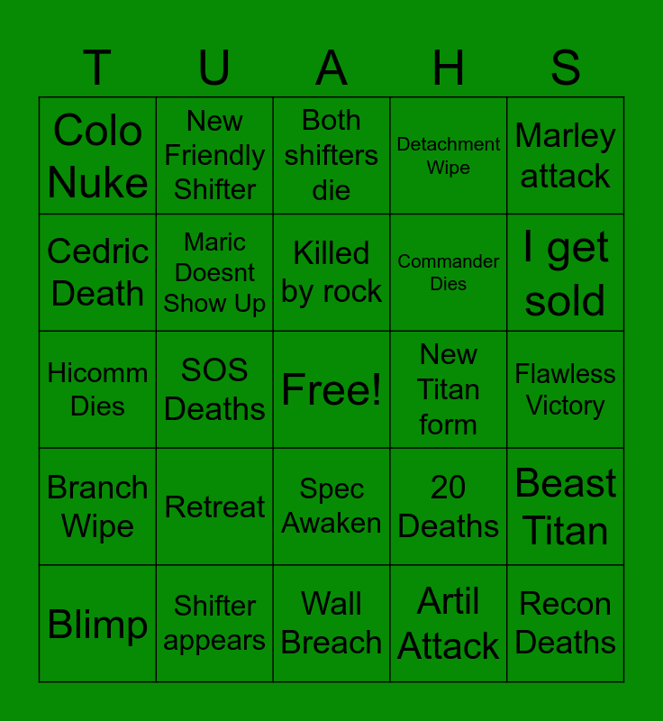 This bingo card has a free space and 24 words: Retreat, Shifter appears, Killed by rock, Blimp, Marley attack, Colo Nuke, Cedric Death, New Friendly Shifter, New Titan form, Spec Awaken, Commander Dies, Hicomm Dies, 20 Deaths, Beast Titan, Maric Doesnt Show Up, Artil Attack, Flawless Victory, Both shifters die, I get sold, SOS Deaths, Recon Deaths, Branch Wipe, Detachment Wipe and Wall Breach.