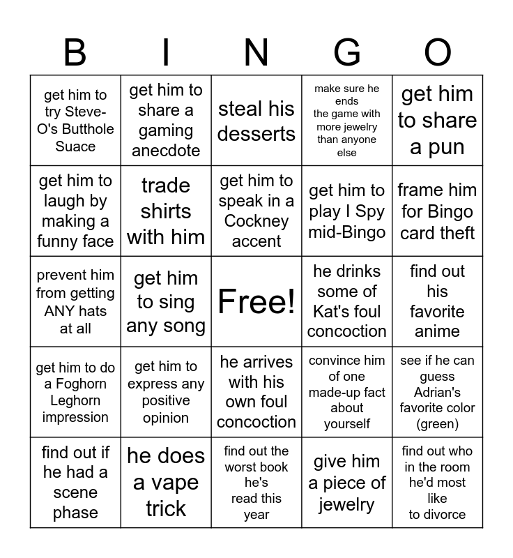 This bingo card has a free space and 24 words: get him to express any positive opinion, he does a vape trick, get him to speak in a Cockney accent, find out if he had a scene phase, get him to share a pun, get him to try Steve-O's Butthole Suace, get him to laugh by making a funny face, get him to share a gaming anecdote, he drinks some of Kat's foul concoction, he arrives with his own foul concoction, get him to play I Spy mid-Bingo, prevent him from getting ANY hats at all, convince him of one made-up fact about yourself, see if he can guess Adrian's favorite color (green), trade shirts with him, give him a piece of jewelry, find out his favorite anime, steal his desserts, frame him for Bingo card theft, get him to sing any song, find out who in the room he'd most like to divorce, get him to do a Foghorn Leghorn impression, make sure he ends the game with more jewelry than anyone else and find out the worst book he's read this year.
