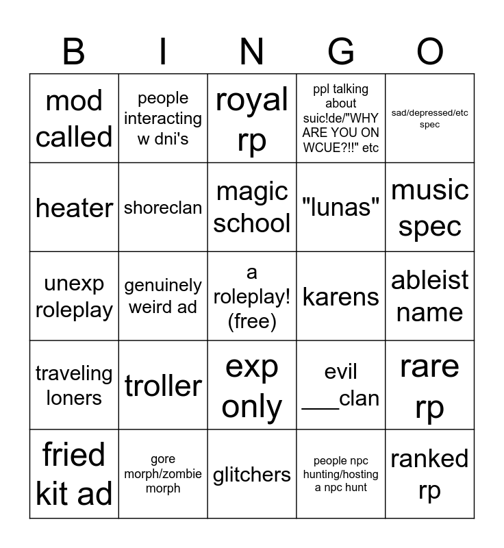 This bingo card has a free space and 24 words: troller, gore morph/zombie morph, magic school, fried kit ad, sad/depressed/etc spec, mod called, heater, people interacting w dni's, karens, exp only, "lunas", unexp roleplay, evil ___clan, rare rp, shoreclan, people npc hunting/hosting a npc hunt, ableist name, royal rp, music spec, genuinely weird ad, ranked rp, traveling loners, ppl talking about suic!de/"WHY ARE YOU ON WCUE?!!" etc and glitchers.