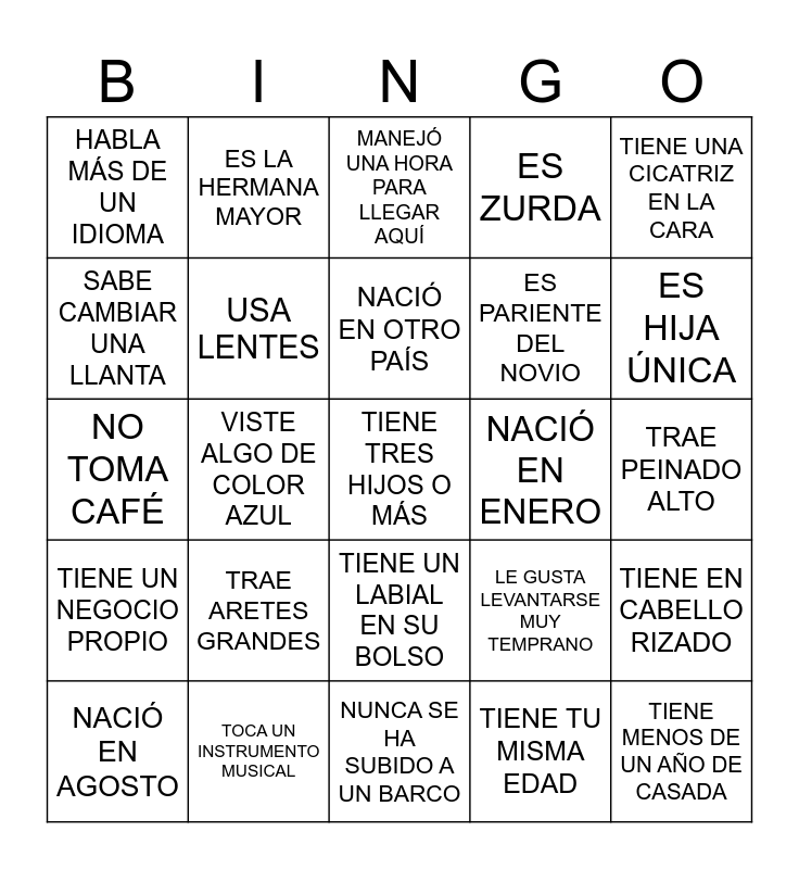 This bingo card has 40 words: TRAE PUESTO UN COLLAR, NO TOMA CAFÉ, ES LA MÁS JOVEN DEL GRUPO, USA LENTES, TOCA UN INSTRUMENTO MUSICAL, TIENE UN LABIAL EN SU BOLSO, NACIÓ EN OTRO PAÍS, HA VIAJADO EN LOS ÚLTIMOS TRES MESES, TIENE UNA CICATRIZ EN LA CARA, TIENE UN NEGOCIO PROPIO, VISTE ALGO DE COLOR AZUL, ES ZURDA, TIENE TRES HIJOS O MÁS, TRAE PEINADO ALTO, NACIÓ EN ENERO, TRAE ARETES GRANDES, SU MASCOTA ES UN GATO, HABLA MÁS DE UN IDIOMA, TIENE SOLO HERMANAS, MANEJÓ UNA HORA PARA LLEGAR AQUÍ, TIENE EN CABELLO RIZADO, TIENE TU MISMA EDAD, ES PARIENTE DEL NOVIO, SABE CAMBIAR UNA LLANTA, TIENE LAS UÑAS PINTADAS DE ROSADO, HA ESTADO CASADA POR MÁS DE 10 AÑOS, USA LENTES DE CONTACTO, SU MASCOTA ES UN PERRO, TIENE MENOS DE UN AÑO DE CASADA, TIENE UN HERMANO, TIENE SOLO UN HIJO, NACIÓ EN AGOSTO, VISTE ALGO COLOR NEGRO, LE GUSTA LEVANTARSE MUY TEMPRANO, ES HIJA ÚNICA, NUNCA SE HA SUBIDO A UN BARCO, NO LE GUSTA EL CHOCOLATE, SE HA SUBIDO A UN HELICOPTERO, ES LA HERMANA MAYOR and TIENE DOS NOMBRES.