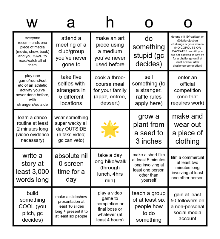 This bingo card has a free space and 24 words: absolute nil 0 screen time for a day, make a slideshow presentation at least 10 slides long + present it to at least six people, cook a three-course meal for your family (appz, entree, dessert), build something COOL (you pitch, gc decides), do one (1) @freakbait or @dailyrejection challenge of your choice (NO COPOUTS OR CAVEATS!! own it!! you are not allowed to say it's for a challenge until at least a week after challenge completion), everyone recommends one piece of media (movie, show, book) and you HAVE to read/watch all of them, play one game/round/set etc of an athletic activity you’ve never done before, with strangers/outside, attend a meeting of a club/group you’ve never gone to, grow a plant from a seed to 3 inches, take a day long hike/walk (through lunch, 4hrs min), sell something (to a stranger. raffle rules apply here), learn a dance routine at least 2 minutes long (video evidence necessary), make a short film at least 5 minutes long involving at least one person other than yourself, film a commercial at least two minutes long involving at least one other person, take five selfies with strangers in 5 different locations, teach a group of at least six people how to do something, make and wear out a piece of clothing, make an art piece using a medium you’ve never used before, enter an official competition (one that requires work), wear something super wacky all day OUTSIDE (n take video; gc can veto), gain at least 50 followers on a non-personal social media account, write a story at least 3,000 words long, do something stupid (gc decides) and play a video game to completion or final boss or whatever (at least 4 hours).