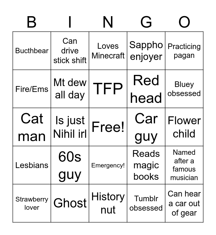 This bingo card has a free space and 24 words: 60s guy, Ghost, TFP, Strawberry lover, Practicing pagan, Bucthbear, Fire/Ems, Can drive stick shift, Car guy, Emergency!, Red head, Cat man, Reads magic books, Named after a famous musician, Mt dew all day, Tumblr obsessed, Flower child, Loves Minecraft, Bluey obsessed, Is just Nihil irl, Can hear a car out of gear, Lesbians, Sappho enjoyer and History nut.