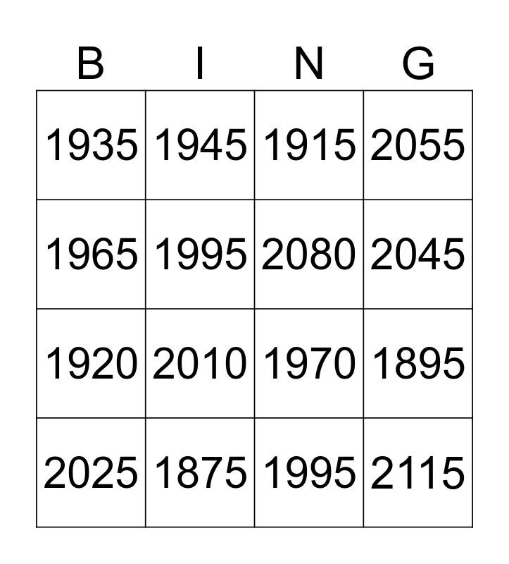 This bingo card has 16 words: 1875, 1895, 1915, 1935, 1920, 1945, 1970, 1995, 1965, 1995, 2025, 2055, 2010, 2045, 2080 and 2115.