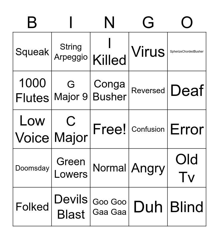 This bingo card has a free space and 26 words: Normal, Duh, Conga Busher, Devils Blast, SpherizeChordedBusher, Squeak, 1000 Flutes, String Arpeggio, Error, Angry, Reversed, Low Voice, Old Tv, Folked, C Major, Earth Tones, Virus, Doomsday, I Killed, Blind, Deaf, Goo Goo Gaa Gaa, Confusion, Green Lowers, G Major 9 and 1st Upside Down Hypercubed.