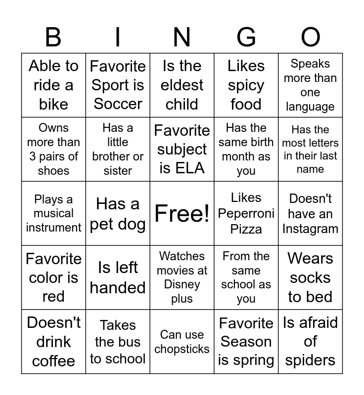 This bingo card has a free space and 24 words: Is left handed, Takes the bus to school, Favorite subject is ELA, Doesn't drink coffee, Speaks more than one language, Able to ride a bike, Owns more than 3 pairs of shoes, Favorite Sport is Soccer, Likes Peperroni Pizza, Watches movies at Disney plus, Has the same birth month as you, Plays a musical instrument, From the same school as you, Wears socks to bed, Has a little brother or sister, Favorite Season is spring, Doesn't have an Instagram, Is the eldest child, Has the most letters in their last name, Has a pet dog, Is afraid of spiders, Favorite color is red, Likes spicy food and Can use chopsticks.