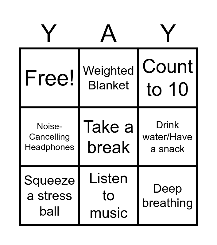 This bingo card has 9 words: Squeeze a stress ball, Count to 10, Weighted Blanket, Noise-Cancelling Headphones, Free!, Drink water/Have a snack, Take a break, Deep breathing and Listen to music.