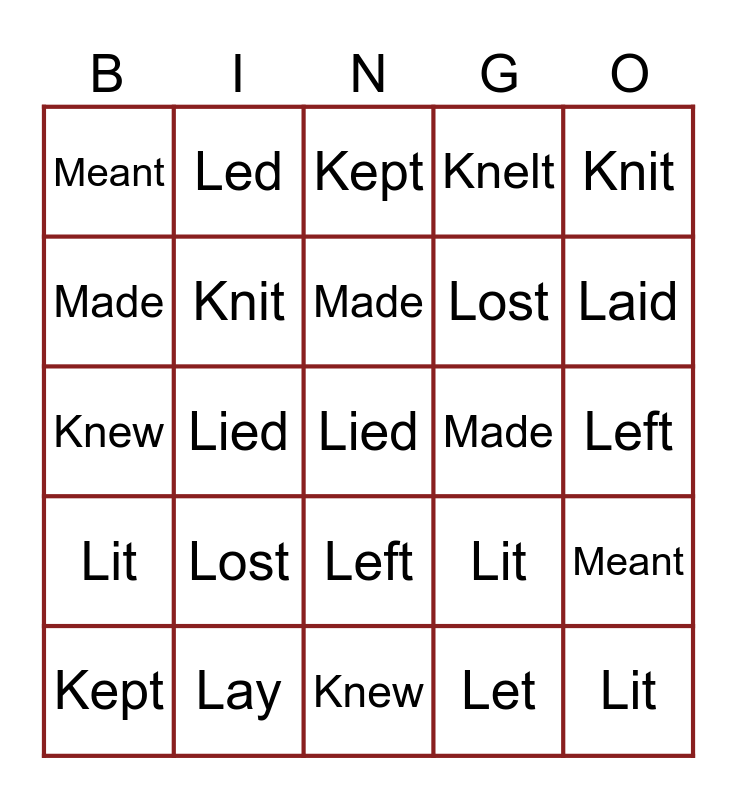 This bingo card has a free space and 24 words: Kept, Lost, Made, Let, Knit, Meant, Led, Kept, Made, Left, Knew, Knit, Lit, Meant, Made, Lay, Knew, Knelt, Laid, Lit, Lied, Left, Lost and Lit.