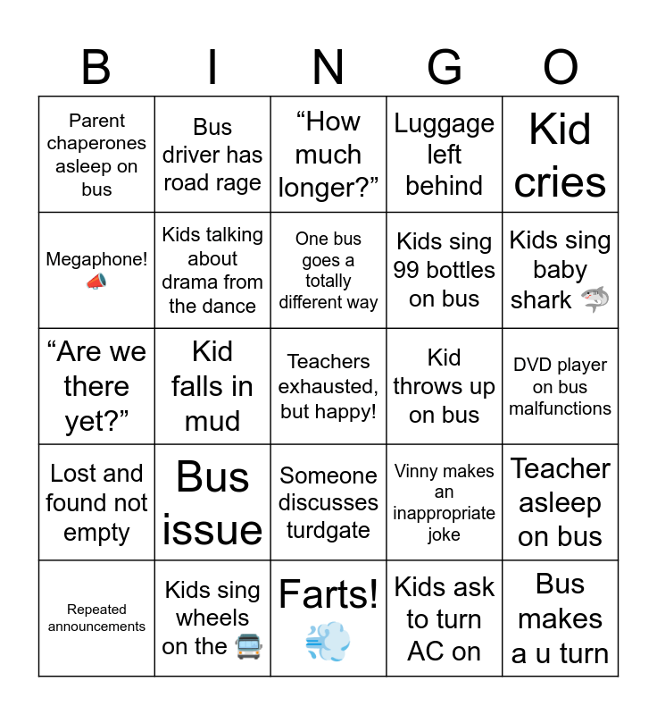 This bingo card has a free space and 24 words: Bus issue, Kids sing wheels on the π, One bus goes a totally different way, Repeated announcements, Kid cries, Parent chaperones asleep on bus, Megaphone! π£, Bus driver has road rage, Kid throws up on bus, Someone discusses turdgate, Kids sing 99 bottles on bus, βAre we there yet?β, Vinny makes an inappropriate joke, Teacher asleep on bus, Kids talking about drama from the dance, Kids ask to turn AC on, DVD player on bus malfunctions, βHow much longer?β, Kids sing baby shark π¦, Kid falls in mud, Bus makes a u turn, Lost and found not empty, Luggage left behind and Farts!π¨.
