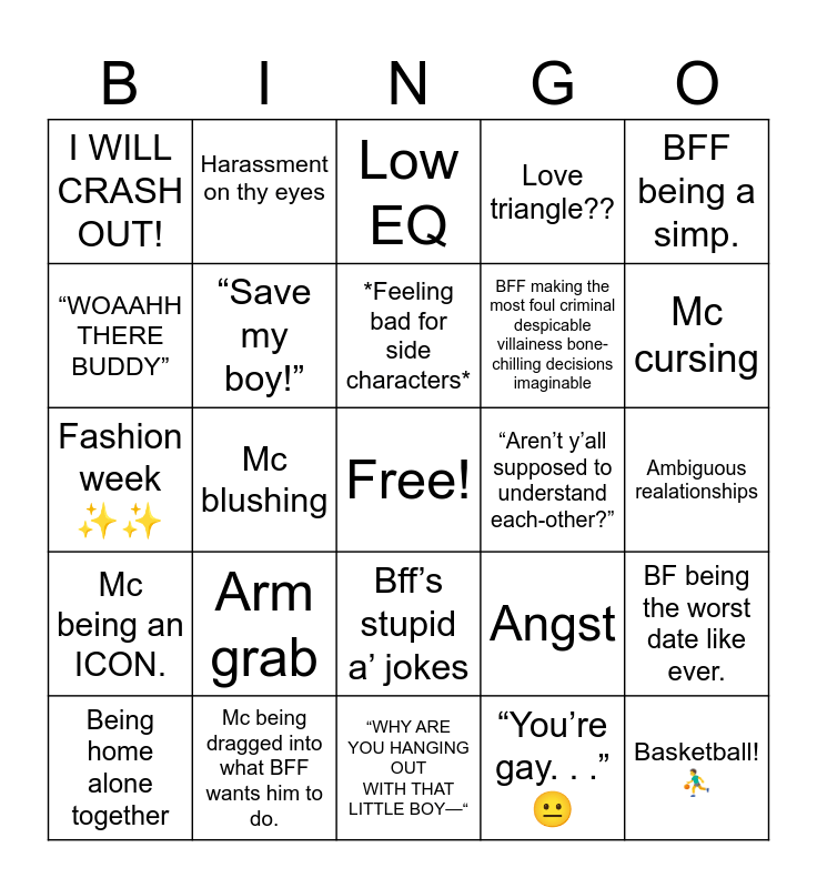 This bingo card has a free space and 39 words: Denial of feelings, Avoidable misunderstandings, #Jealous, “Save my boy!”, Being home alone together, Bff’s stupid a’ jokes, *Feeling bad for side characters*, Bro getting wishes like air., BFF being a simp., Mc being an ICON., Mc blushing, Love triangle??, Basketball! ⛹️♂️, Ambiguous realationships, “Aren’t y’all supposed to understand each-other?”, Arm grab, Bro, you won’t find me at this cook out., I WILL CRASH OUT!, Fluff?, Angst, “WOAAHH THERE BUDDY”, “WHY ARE YOU HANGING OUT WITH THAT LITTLE BOY—“, BFF making the most foul criminal despicable villainess bone-chilling decisions imaginable, Mc cursing, Mc and BFF texting, Pro-Mcs taking initiative (against the world), 😐, Weird art “glitch”, Kissing, hugging, or touching between MC and BFF, Harassment on thy eyes, BFF being a good friend., Confessions and peptalks., Low EQ, Mc being dragged into what BFF wants him to do., “You’re gay. . .” 😐, PUT BACK YOUR SHIRT ON!, BF being the worst date like ever., Fashion week ✨✨ and Nice art!.