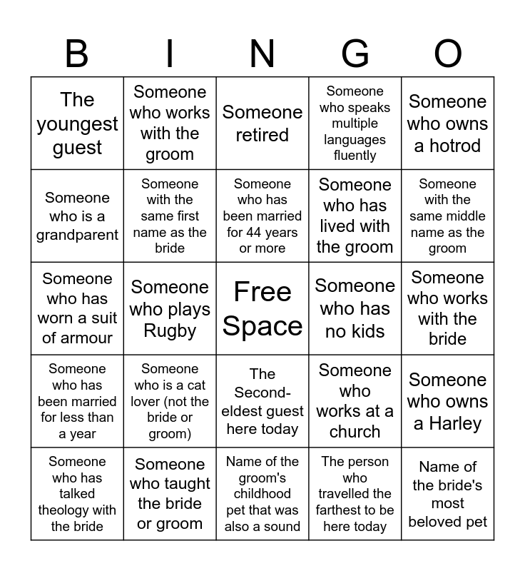 This bingo card has a free space and 24 words: Someone who is a cat lover (not the bride or groom), Someone who taught the bride or groom, Someone who has been married for 44 years or more, Someone who has talked theology with the bride, Someone who owns a hotrod, The youngest guest, Someone who is a grandparent, Someone who works with the groom, Someone who has no kids, The Second-eldest guest here today, Someone who has lived with the groom, Someone who has worn a suit of armour, Someone who works at a church, Someone who owns a Harley, Someone with the same first name as the bride, The person who travelled the farthest to be here today, Someone who works with the bride, Someone retired, Someone with the same middle name as the groom, Someone who plays Rugby, Name of the bride's most beloved pet, Someone who has been married for less than a year, Someone who speaks multiple languages fluently and Name of the groom's childhood pet that was also a sound.