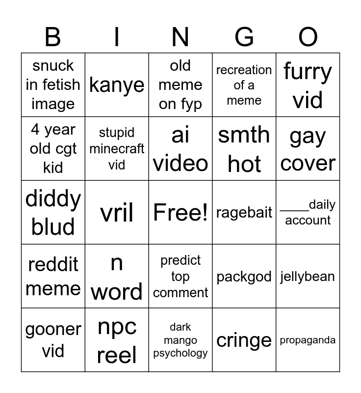 This bingo card has a free space and 24 words: n word, npc reel, ai video, gooner vid, furry vid, snuck in fetish image, 4 year old cgt kid, kanye, ragebait, predict top comment, smth hot, diddy blud, packgod, jellybean, stupid minecraft vid, cringe, ____daily account, old meme on fyp, gay cover, vril, propaganda, reddit meme, recreation of a meme and dark mango psychology.