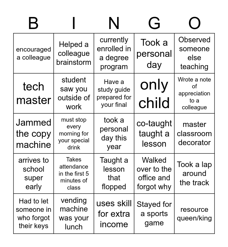 This bingo card has a free space and 29 words: Had to let someone in who forgot their keys, Slept through an alarm, must stop every morning for your special drink, attended a Teams/zoom meeting with, encouraged a colleague, currently enrolled in a degree program, student saw you outside of work, Takes attendance in the first 5 minutes of class, co-taught taught a lesson, vending machine was your lunch, master classroom decorator, resource queen/king, uses skill for extra income, Stayed for a sports game, Wrote a note of appreciation to a colleague, Leaves work on time, Taught a lesson that flopped, arrives to school super early, Observed someone else teaching, Jammed the copy machine, Walked over to the office and forgot why, Has a professional social media page, only child, tech master, Took a personal day, Helped a colleague brainstorm, Took a lap around the track, Have a study guide prepared for your final and Made a New Year's resolution related to school.
