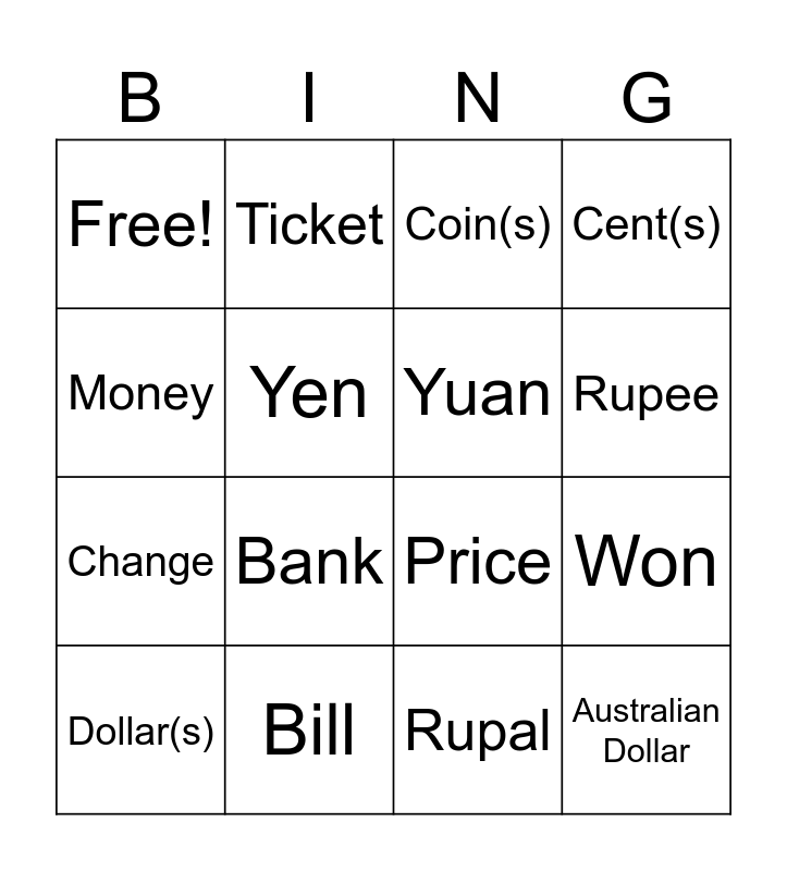 This bingo card has 16 words: Dollar(s), Bill, Coin(s), Cent(s), Money, Ticket, Price, Won, Free!, Yen, Rupal, Rupee, Change, Bank, Yuan and Australian Dollar.