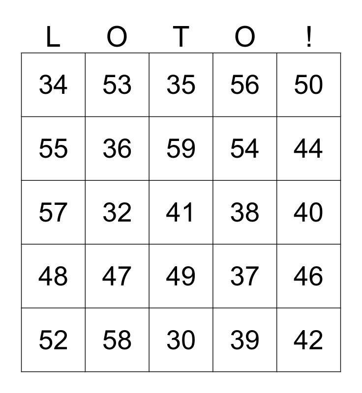 This bingo card has 31 words: 30, 31, 32, 33, 34, 35, 36, 37, 38, 39, 40, 41, 42, 43, 44, 45, 46, 47, 48, 49, 50, 51, 52, 53, 54, 55, 56, 57, 58, 59 and 60.