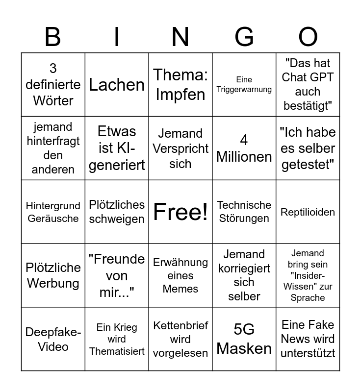 This bingo card has a free space and 29 words: Deepfake-Video, Ein Politiker Name, Plötzliches schweigen, Eine Auflistung von Fake News, 3 definierte Wörter, Thema: Impfen, Etwas ist KI- generiert, "Freunde von mir...", Technische Störungen, Ein Krieg wird Thematisiert, Reptilioiden, Eine Fake News wird unterstützt, Kettenbrief wird vorgelesen, 5G Masken, "Ich habe es selber getestet", Ein Tier wird erwähnt, Erwähnung eines Memes, Plötzliche Werbung, "Das hat Chat GPT auch bestätigt", Hintergrund Geräusche, Jemand korriegiert sich selber, "Denk mal logisch", 4 Millionen, jemand hinterfragt den anderen, Eine Triggerwarnung, Lachen, Jemand bring sein "Insider-Wissen" zur Sprache, Jemand Verspricht sich and Äußerung der Persönlichen Meinung.
