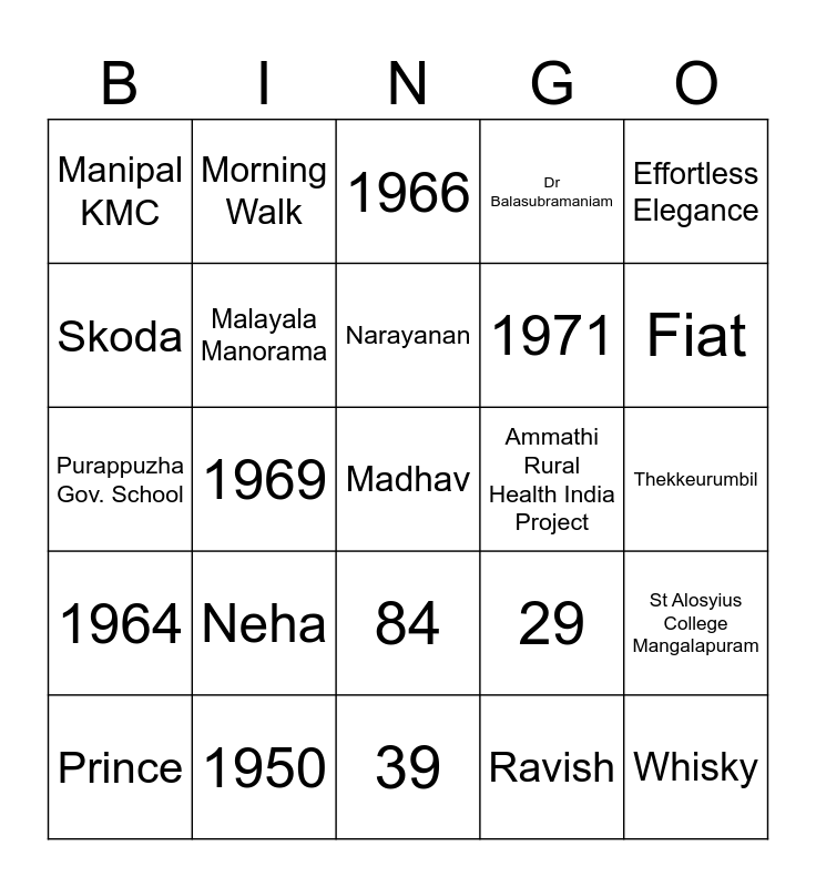This bingo card has 90 words: Dr T K Shivan, 11 July 1941, 84, Shathabhishekam, Cancer, Thiruvonam, Height, Weight, 42, Parvathy, January 1900, Itta Kela, Itta, Thekkeurumbil, 7, Narayanan, Raman, Keshavan, Kumaran, Bhanumathy, Lakshmikutty, Kamala, 39, Purappuzha Thodupuzha, Purappuzha Gov. School, 1950, Magdoor Estate, Dasalam, Nanjaraaya Patna L P School, Kushal Nagara Fathima High School, St Michael’s High School Mercara, St Alosyius College Mangalapuram, BSc, 1964, Manipal KMC, Dr Balasubramaniam, 1966, Lambretta Scooter, 1969, Fiat, Prince, Skoda, 1970, 25 May 1970, Dr Lalitha, 29, Emerald, TVM Medical College, Dr Omana Mathew, Dr K N Pai, Srilanka, 1971, Mangalore KMC, 1974, Construction, Navaneeth Siddapur, Ammathi Rural Health India Project, 1976, PVS Hospital Calicut, 1980, Navaneeth Kannur, 1998, Specialty Hospital Kannur, Dr P P Ravindran, Naveen, Neeta, December 1998, Ravish, Maalu, Jhanvi, Neha, Madhav, Jai, 5 Languages, Morning Walk, Malayala Manorama, Rice and Fish Curry, Thairu Sadam, Payasam, Poovan Pazham, Whisky, Effortless Elegance, Family Man, Asha Parekh, Rajendra Kumar, Badminton, Mohanlal, Amitabh Bachchan, Ultimate Host and Heart of Gold.
