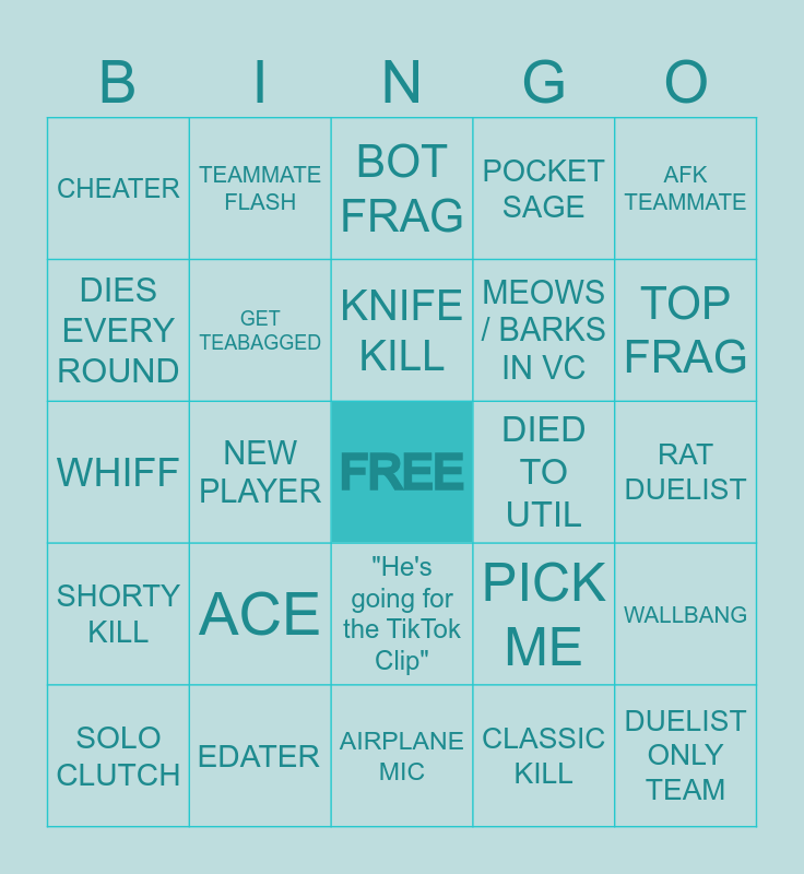 This bingo card has a free space and 24 words: ACE, EDATER, KNIFE KILL, SOLO CLUTCH, AFK TEAMMATE, CHEATER, DIES EVERY ROUND, TEAMMATE FLASH, DIED TO UTIL, "He's going for the TikTok Clip", MEOWS / BARKS IN VC, WHIFF, PICK ME, WALLBANG, GET TEABAGGED, CLASSIC KILL, RAT DUELIST, BOT FRAG, TOP FRAG, NEW PLAYER, DUELIST ONLY TEAM, SHORTY KILL, POCKET SAGE and AIRPLANE MIC.