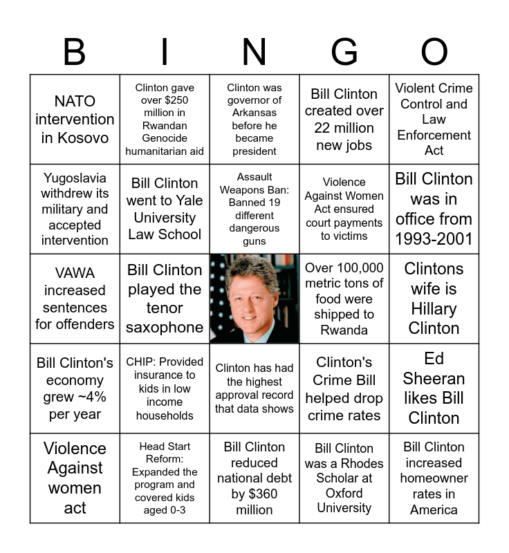 This bingo card has a free space and 24 words: CHIP: Provided insurance to kids in low income households, Head Start Reform: Expanded the program and covered kids aged 0-3, Assault Weapons Ban: Banned 19 different dangerous guns, Violence Against women act, Violent Crime Control and Law Enforcement Act, NATO intervention in Kosovo, Yugoslavia withdrew its military and accepted intervention, Clinton gave over $250 million in Rwandan Genocide humanitarian aid, Over 100,000 metric tons of food were shipped to Rwanda, Clinton has had the highest approval record that data shows, Violence Against Women Act ensured court payments to victims, VAWA increased sentences for offenders, Clinton's Crime Bill helped drop crime rates, Ed Sheeran likes Bill Clinton, Bill Clinton went to Yale University Law School, Bill Clinton was a Rhodes Scholar at Oxford University, Clintons wife is Hillary Clinton, Clinton was governor of Arkansas before he became president, Bill Clinton was in office from 1993-2001, Bill Clinton played the tenor saxophone, Bill Clinton increased homeowner rates in America, Bill Clinton's economy grew ~4% per year, Bill Clinton created over 22 million new jobs and Bill Clinton reduced national debt by $360 million.