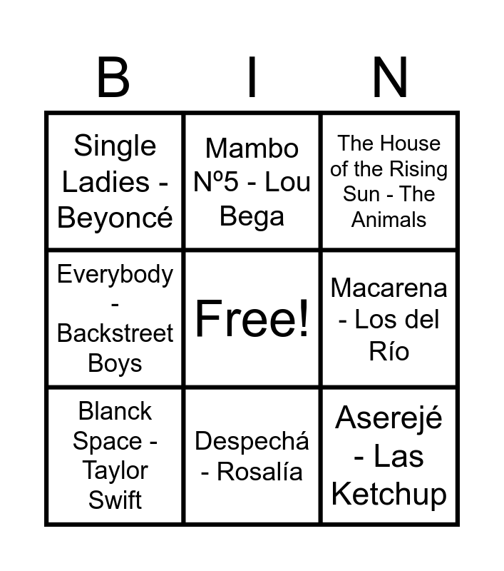This bingo card has a free space and 25 words: Saturday Night - Whigfield, Hips don’t lie - Shakira, Despechá - Rosalía, La Bomba - King Africa, Aserejé - Las Ketchup, Single Ladies - Beyoncé, Macarena - Los del Río, Mambo Nº5 - Lou Bega, YMCA - Village People, Wannabe - Spice Girls, Gasolina - Daddy Yankee, Sarandonga - Lolita, Que la detengan - David Civera, Si antes te hubiera conocido - Karol G, Blanck Space - Taylor Swift, Girl on Fire - Alicia Keys, Summer Nights - John Travolta & Olivia Newton-John, The House of the Rising Sun - The Animals, We will rock you - Queen, Twist and Shout - The Beatles, Flowers - Miley Cyrus, Dancing Queen - ABBA, Sweet Caroline - Niel Diamond, Everybody - Backstreet Boys and Say my name - Destiny's child.