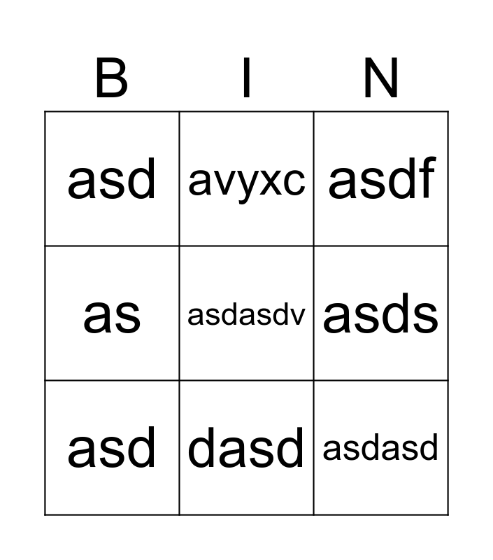 This bingo card has a free space and 8 words: asds, asdf, avyxc, asd, asd, asdasd, as and dasd.