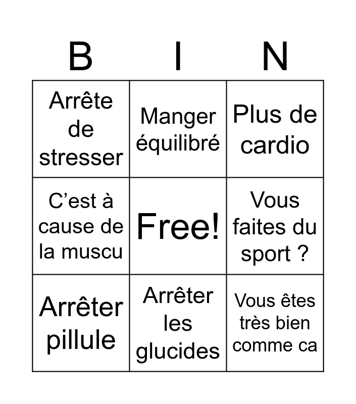 This bingo card has a free space and 8 words: Vous faites du sport ?, Plus de cardio, Manger équilibré, Arrêter pillule, Arrête de stresser, Vous êtes très bien comme ca, C’est à cause de la muscu and Arrêter les glucides.