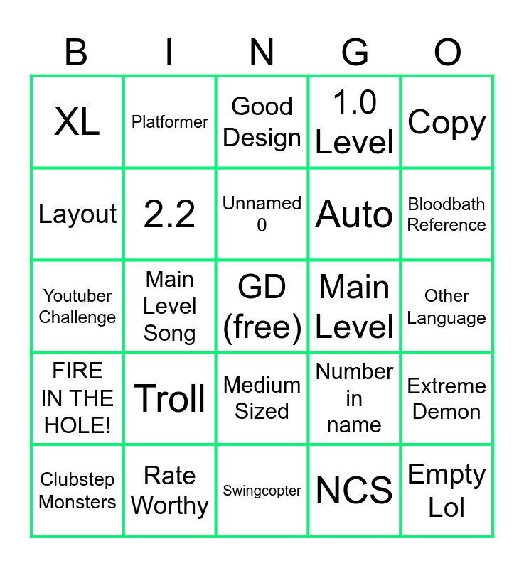 This bingo card has a free space and 24 words: Clubstep Monsters, Troll, Unnamed 0, NCS, Copy, XL, Platformer, Good Design, Main Level, Other Language, Youtuber Challenge, 2.2, Number in name, Extreme Demon, Layout, Rate Worthy, Swingcopter, 1.0 Level, Bloodbath Reference, FIRE IN THE HOLE!, Main Level Song, Medium Sized, Auto and Empty Lol.
