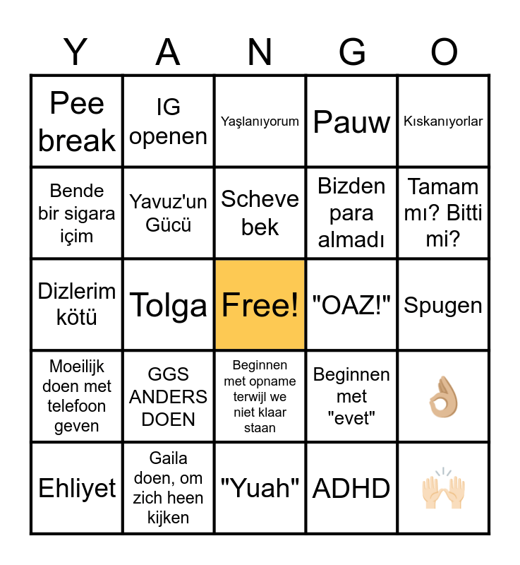 This bingo card has a free space and 24 words: GGS ANDERS DOEN, Gaila doen, om zich heen kijken, Scheve bek, Ehliyet, Kıskanıyorlar, Pee break, Bende bir sigara içim, IG openen, "OAZ!", Beginnen met opname terwijl we niet klaar staan, Bizden para almadı, Dizlerim kötü, Beginnen met "evet", 👌🏼, Yavuz'un Gücü, ADHD, Spugen, Yaşlanıyorum, Tamam mı? Bitti mi?, Tolga, 🙌🏻, Moeilijk doen met telefoon geven, Pauw and "Yuah".