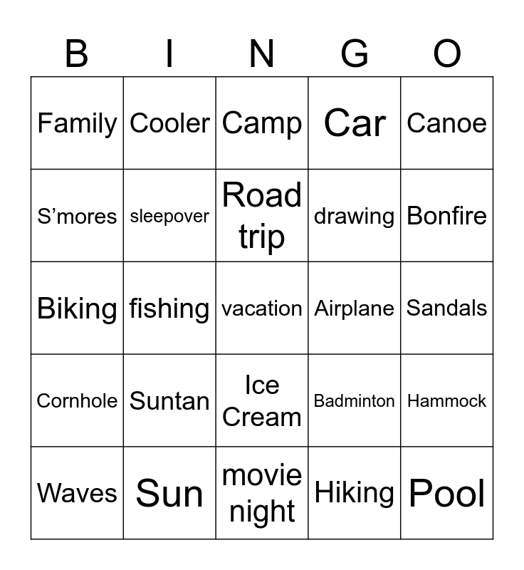 This bingo card has 45 words: Beach, vacation, Shell, Waves, Swim, Hiking, Camp, Grill, Canoe, Sun, Car, Airplane, Ice Cream, Suntan, Garden, movie night, Barbecue, Biking, Boating, Bonfire, Cooler, travel, Tent, Family, Fireworks, Sandals, Baseball, Frisbee, Badminton, Cornhole, hot weather, Hammock, sleep, Burgers, Jet ski, fishing, Kite, Park, Pool, Road trip, S’mores, drawing, bug spray, sleepover and friends.