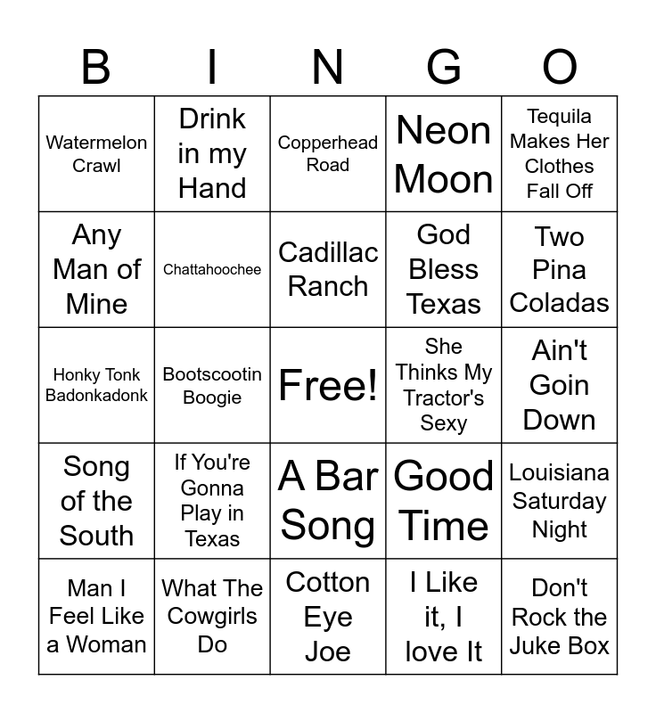 This bingo card has a free space and 31 words: Cotton Eye Joe, Achy Breaky Heart, Bootscootin Boogie, Chicken Fried, Watermelon Crawl, Copperhead Road, Chattahoochee, Good Time, She Thinks My Tractor's Sexy, I Like it, I love It, Ain't Goin Down, Don't Rock the Juke Box, As Good As I Once Was, Beer For My Horses, Two Pina Coladas, TROUBLE, Louisiana Saturday Night, If You're Gonna Play in Texas, Song of the South, A Bar Song, Tequila Makes Her Clothes Fall Off, Country Girl Shake it for me, Man I Feel Like a Woman, Drink in my Hand, God Bless Texas, Any Man of Mine, Neon Moon, Honky Tonk Badonkadonk, What The Cowgirls Do, Cadillac Ranch and Mr. Lonely.