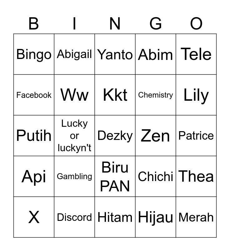 This bingo card has a free space and 24 words: Gambling, Discord, Kkt, X, Tele, Bingo, Facebook, Abigail, Zen, Biru PAN, Chemistry, Putih, Chichi, Thea, Ww, Hijau, Patrice, Yanto, Lily, Lucky or luckyn't, Merah, Api, Abim and Hitam.