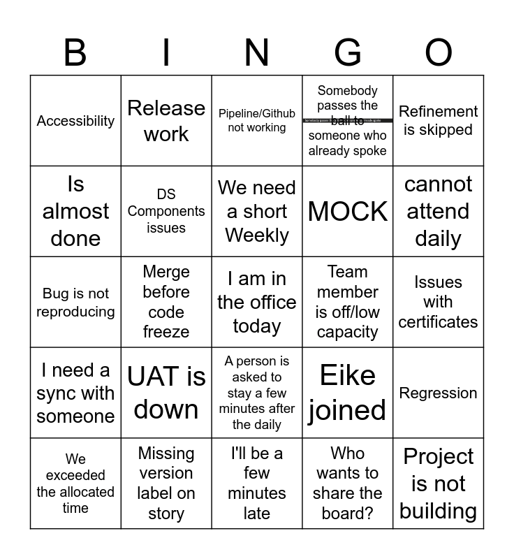 This bingo card has 1 images and 25 words: UAT is down, I'll be a few minutes late, We need a short Weekly, We exceeded the allocated time, Refinement is skipped, Accessibility, Is almost done, Release work, Team member is off/low capacity, A person is asked to stay a few minutes after the daily, MOCK, Bug is not reproducing, Eike joined, Regression, DS Components issues, Project is not building, Issues with certificates, Pipeline/Github not working, cannot attend daily, Merge before code freeze, I am in the office today, Missing version label on story, I need a sync with someone, Somebody passes the ball to someone who already spoke and Who wants to share the board?.