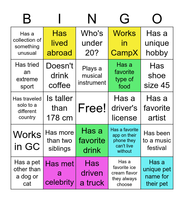 This bingo card has a free space and 24 words: Has more than two siblings, Has met a celebrity, Plays a musical instrument, Has a pet other than a dog or cat, Has a unique hobby, Has a collection of something unusual, Has tried an extreme sport, Has lived abroad, Has a driver's license, Has a favorite drink, Has a favorite type of food, Has traveled solo to a different country, Has a favorite app on their phone they can't live without, Has been to a music festival, Doesn't drink coffee, Has a favorite ice cream flavor they always choose, Has a favorite artist, Who's under 20?, Has shoe size 45, Is taller than 178 cm, Has a unique pet name for their pet, Works in GC, Works in CampX and Has driven a truck.