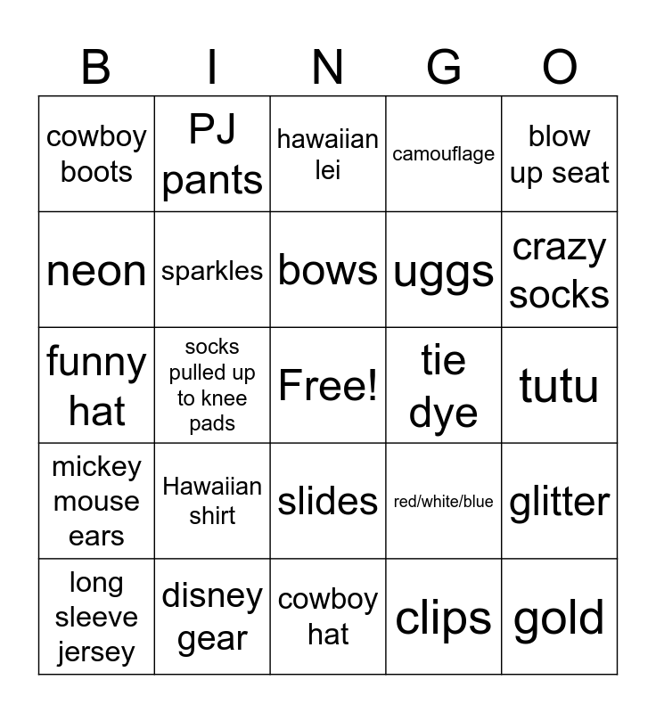 This bingo card has a free space and 25 words: Hawaiian shirt, cowboy hat, bows, long sleeve jersey, blow up seat, cowboy boots, neon, PJ pants, tie dye, slides, uggs, funny hat, red/white/blue, glitter, sparkles, volleyball pants, tutu, hawaiian lei, crazy socks, socks pulled up to knee pads, gold, disney gear, mickey mouse ears, camouflage and clips.
