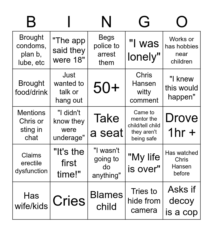 This bingo card has a free space and 24 words: "It's the first time!", Cries, 50+, Has wife/kids, Works or has hobbies near children, Brought condoms, plan b, lube, etc, Brought food/drink, "The app said they were 18", Came to mentor the child/tell child they aren't being safe, "I wasn't going to do anything", Chris Hansen witty comment, Mentions Chris or sting in chat, "My life is over", Has watched Chris Hansen before, Just wanted to talk or hang out, Tries to hide from camera, Drove 1hr +, Begs police to arrest them, "I knew this would happen", "I didn't know they were underage", Asks if decoy is a cop, Claims erectile dysfunction, "I was lonely" and Blames child.