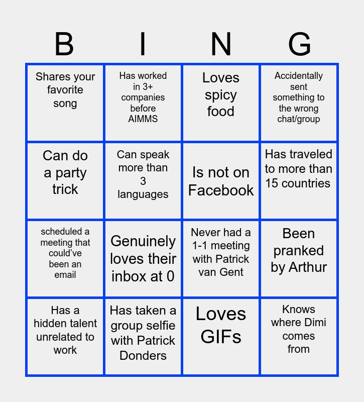 This bingo card has 26 words: Has met a celebrity, Middle child, Has traveled to more than 15 countries, Is someone you’ve never talked to before, Can do a party trick, Shares your favorite song, Can speak more than 3 languages, Has worked in 3+ companies before AIMMS, Loves GIFs, Visited a customer with a coworker, scheduled a meeting that could’ve been an email, Never had a 1-1 meeting with Patrick van Gent, Is left-handed, Once worked a totally different job (ask what), Been pranked by Arthur, Has a cute pet, Accidentally sent something to the wrong chat/group, Knows where Dimi comes from, Loves spicy food, Has a hidden talent unrelated to work, Genuinely loves their inbox at 0, Never asked Frank for help, Has taken a group selfie with Patrick Donders, Went to a running event with Fergus, Is not on Facebook and Has absolutely no idea what someone in another team does.
