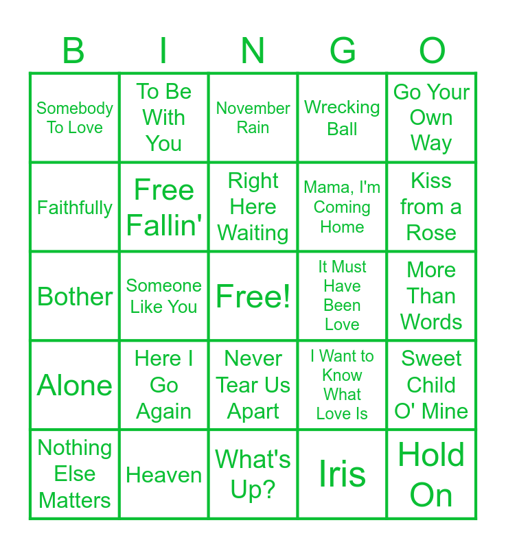 This bingo card has a free space and 49 words: I Have Nothing, Hold On, Don't Stop Believin', What's Up?, Here I Go Again, I'm with You, To Be With You, Total Eclipse of the Heart, Faithfully, Livin' On A Prayer, Free Fallin', Wrecking Ball, Sweet Child O' Mine, I Want to Know What Love Is, (I've Had) The Time of My Life, Rosanna, Right Here Waiting, It Must Have Been Love, Purple Rain, Go Your Own Way, Someone Like You, Iris, Somebody To Love, Mama, I'm Coming Home, When I See You Smile, Kiss from a Rose, Nothing Else Matters, I'd Do Anything For Love (But I Won't Do That), Never Tear Us Apart, Alone, I Don't Want to Miss a Thing, (I Just) Died In Your Arms, Against All Odds (Take A Look At Me Now), (Everything I Do) I Do It For You, Heaven, Every Rose Has Its Thorn, Keep on Loving You, I Remember You, More Than Words, Every Breath You Take, The Reason, Here Without You, Nothing Compares 2 U, With Arms Wide Open, Bother, November Rain, More Than a Feeling, Dust in the Wind and What's Love Got to Do with It.