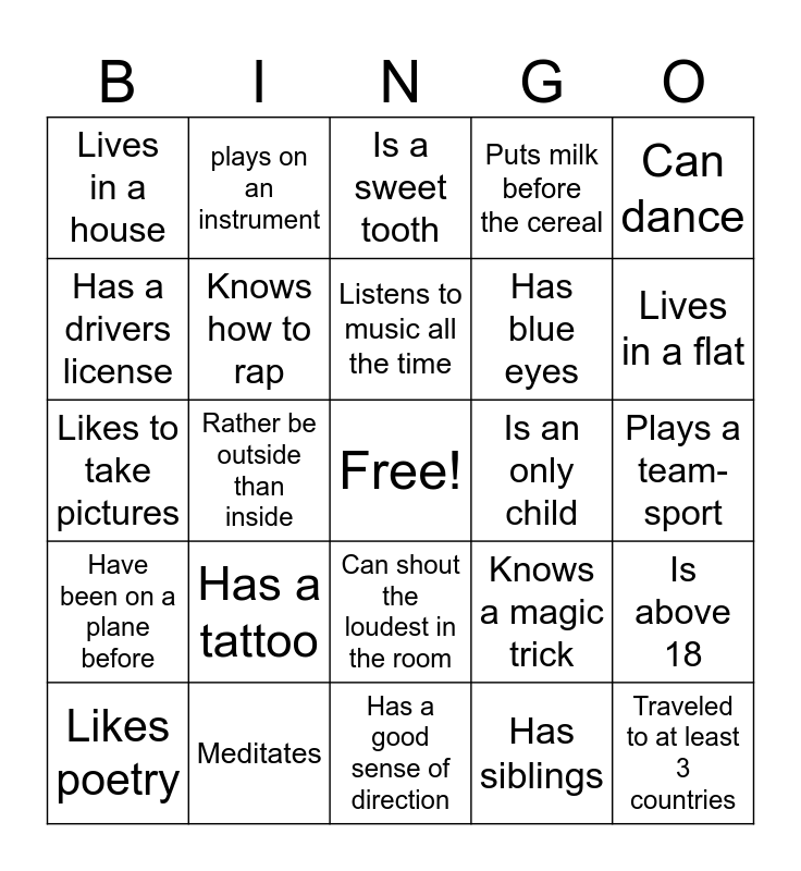 This bingo card has a free space and 24 words: Has a tattoo, Meditates, Listens to music all the time, Likes poetry, Can dance, Lives in a house, Has a drivers license, plays on an instrument, Is an only child, Can shout the loudest in the room, Has blue eyes, Likes to take pictures, Knows a magic trick, Is above 18, Knows how to rap, Has siblings, Plays a team-sport, Is a sweet tooth, Lives in a flat, Rather be outside than inside, Traveled to at least 3 countries, Have been on a plane before, Puts milk before the cereal and Has a good sense of direction.