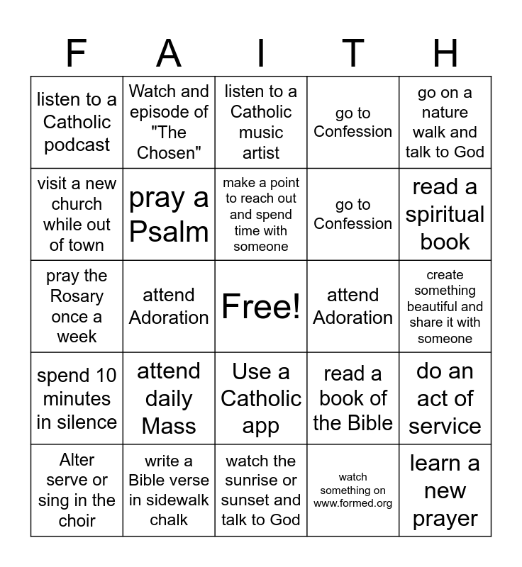 This bingo card has a free space and 24 words: attend daily Mass, write a Bible verse in sidewalk chalk, make a point to reach out and spend time with someone, Alter serve or sing in the choir, go on a nature walk and talk to God, listen to a Catholic podcast, visit a new church while out of town, Watch and episode of "The Chosen", attend Adoration, Use a Catholic app, go to Confession, pray the Rosary once a week, read a book of the Bible, do an act of service, pray a Psalm, watch something on www.formed.org, create something beautiful and share it with someone, listen to a Catholic music artist, read a spiritual book, attend Adoration, learn a new prayer, spend 10 minutes in silence, go to Confession and watch the sunrise or sunset and talk to God.